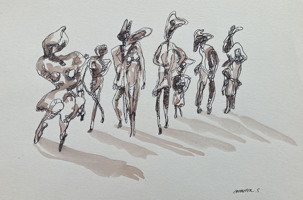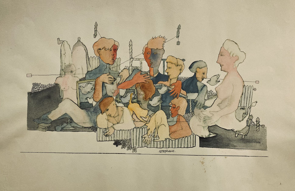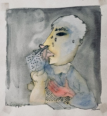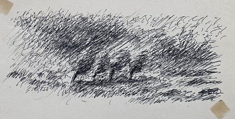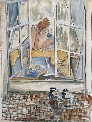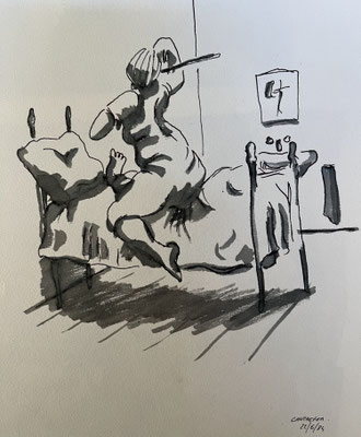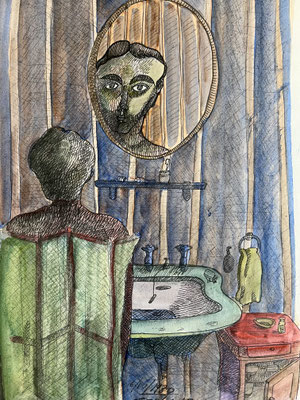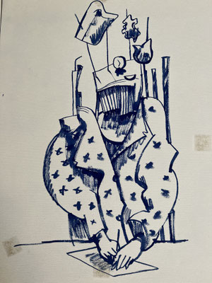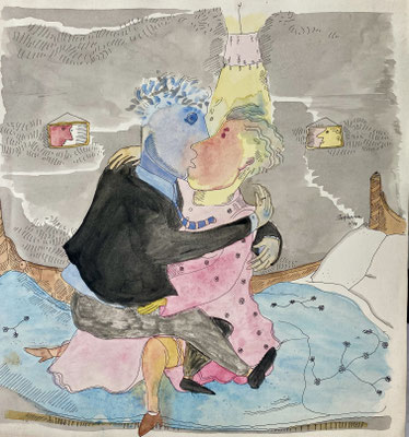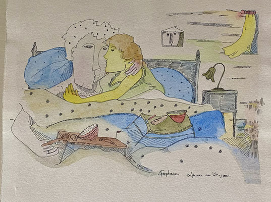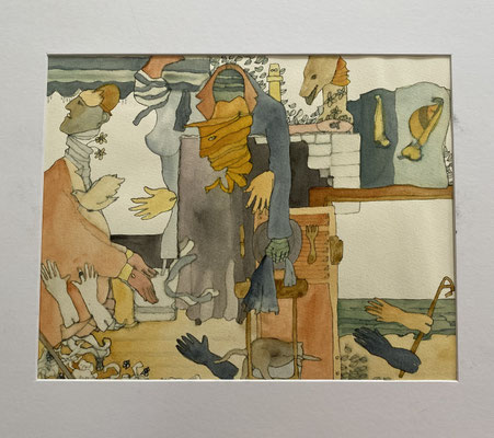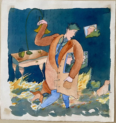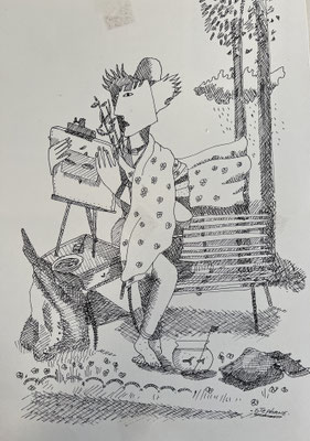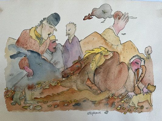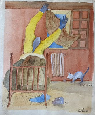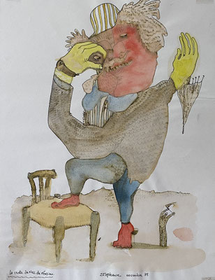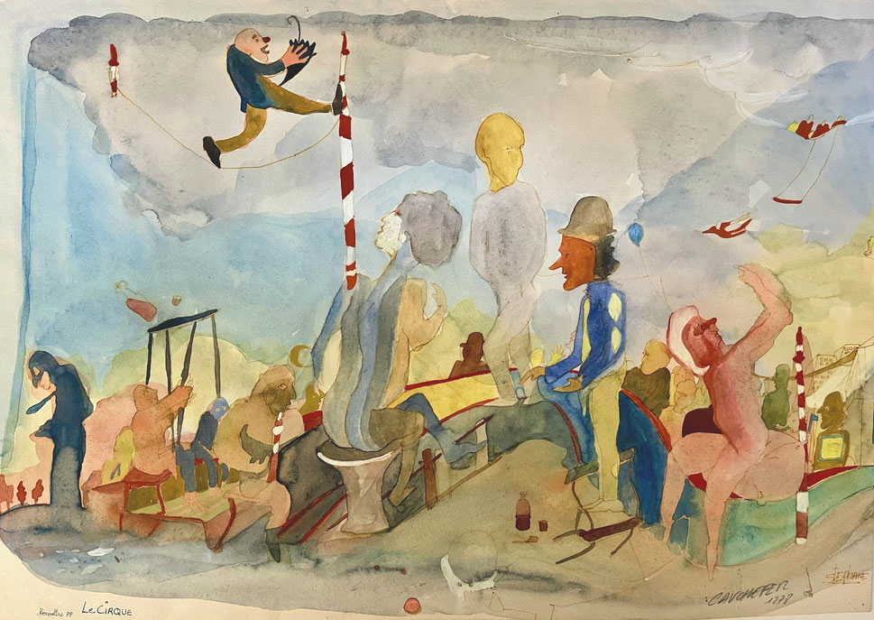 L'aquarelle ci dessous à l'origine de tout. Esquisse préparatoire d'une peinture de 3,50m de large sur les murs de mon école. J'ai crée trois peintures dans cet esprit, la passion a commencé là. Je n'ai plus la trace photo que de ces peintures. Nous sommes en février 1978. Le bâtiment a été détruit. En hiver, un cirque séjournait au fond du bois du pensionnat...